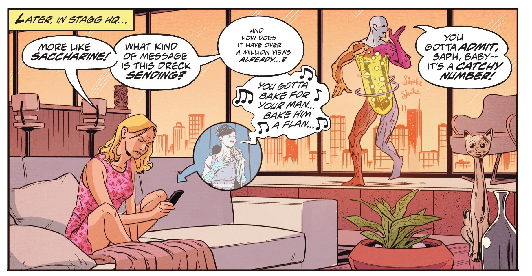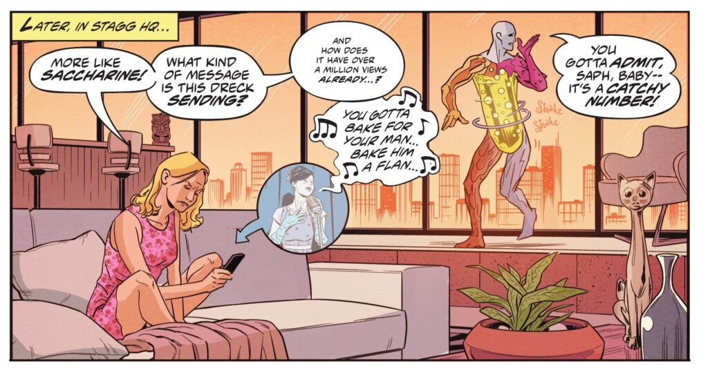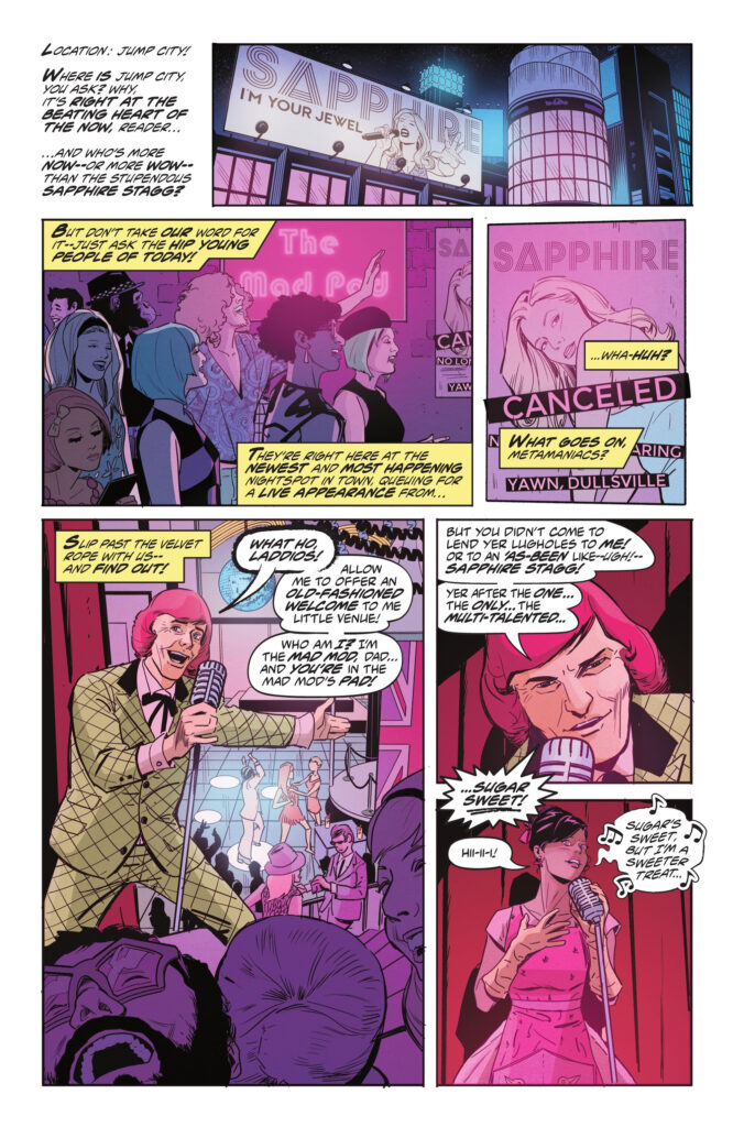 Metafiction aside, the comic works because Al Ewing isn’t just a clever creator, but also a pro who knows how to simultaneously craft a nifty superhero yarn, making great use of Metamorpho’s chemistry-based powers. Plus, he weaves in a bunch of relatively obscure DCU characters, offering another treat to fans while taking advantage of the jokey narration to fill in newcomers on the necessary background (in some cases, it’s even more entertaining if you haven’t come across all these wild concepts before…).