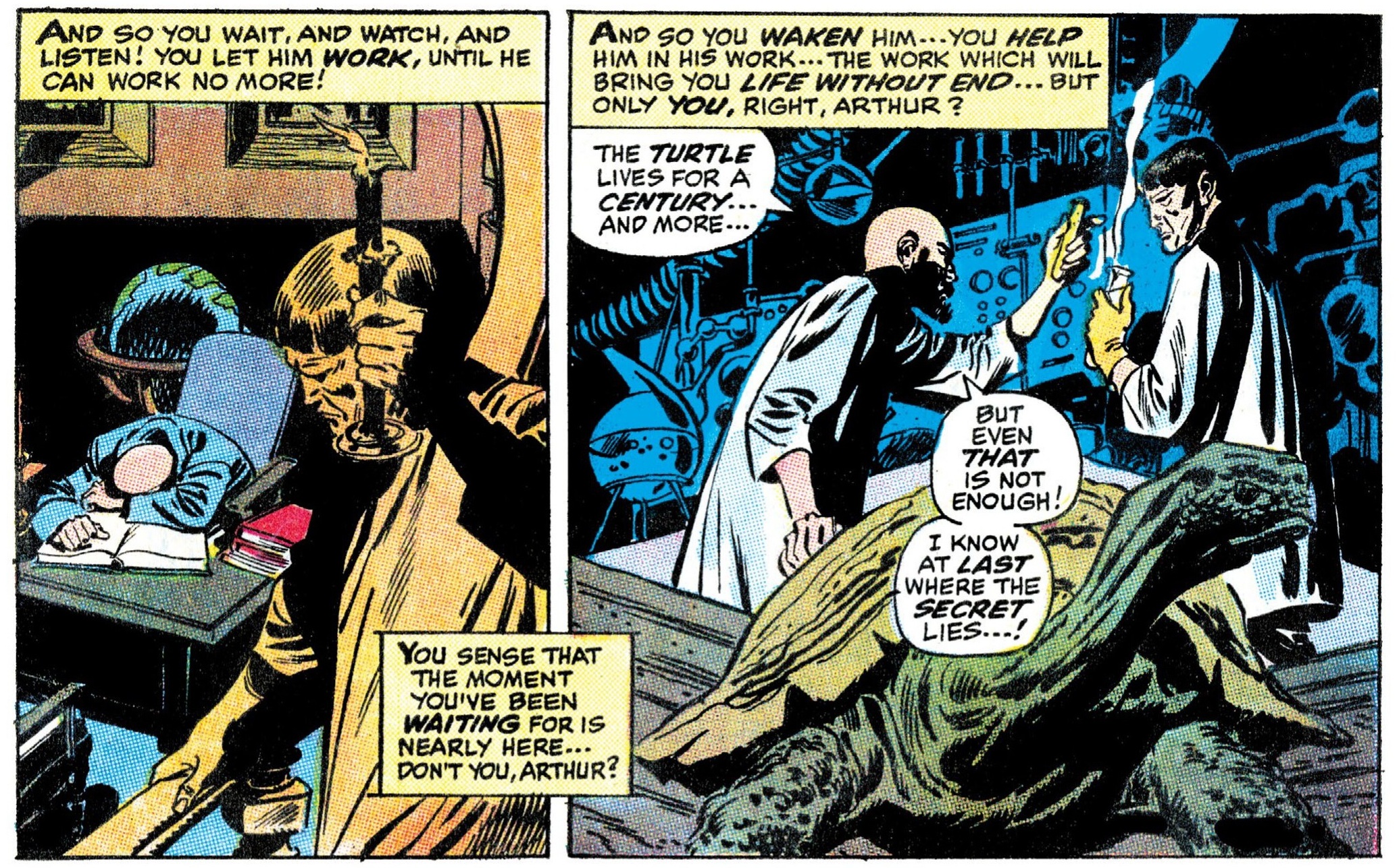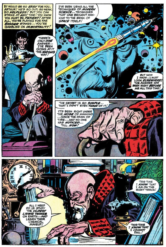 I’m particularly fond of John Buscema’s mise-en-scene in ‘A Time to Die!,’ where a scheming scientist and his assistant search for a formula for immortality while plotting to kill each other: