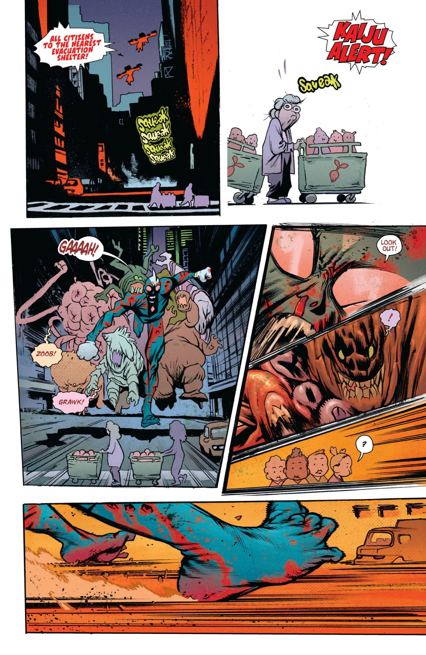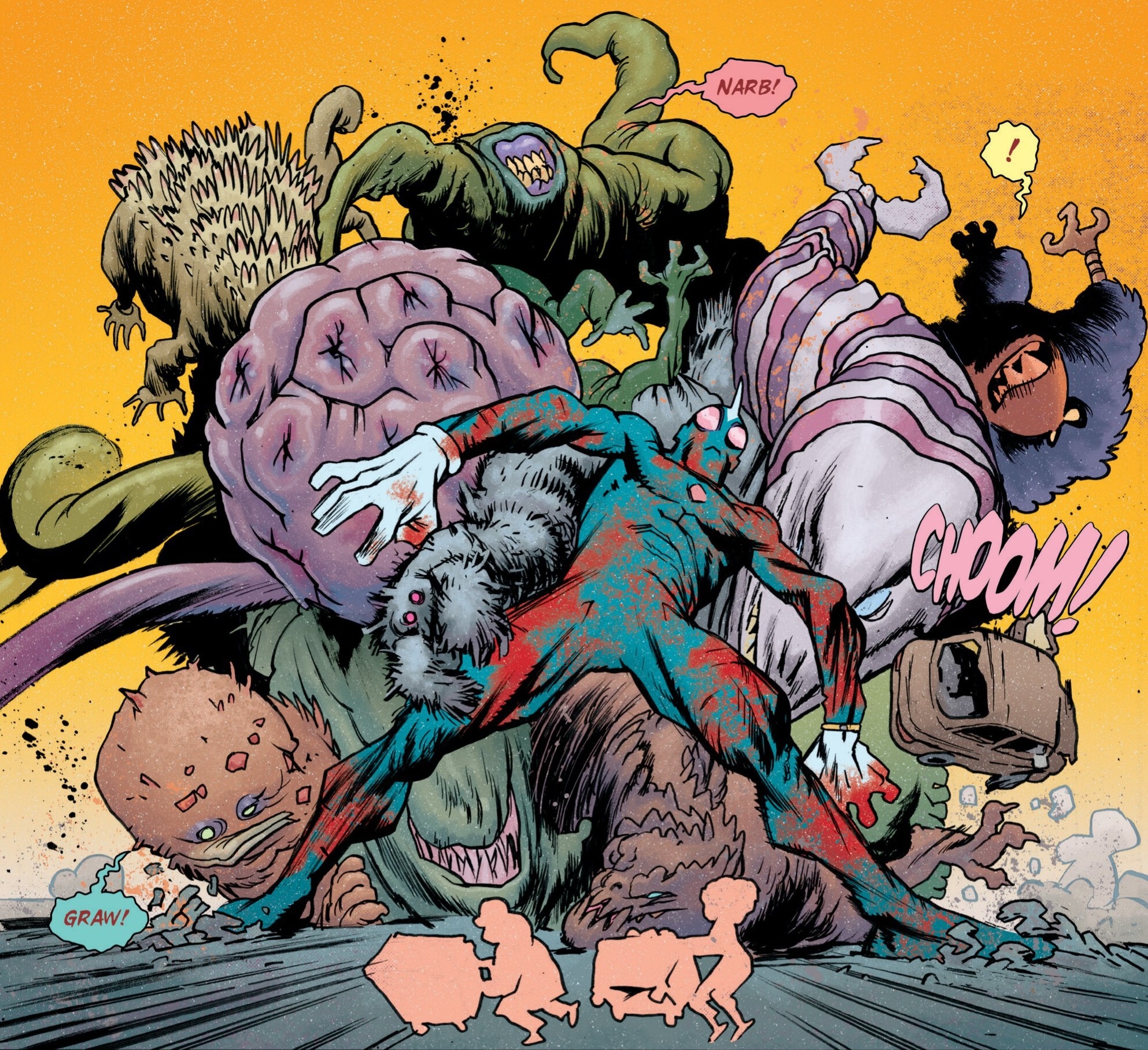 I’m not an expert in this genre, even if I love the original Godzilla film and I’m an even bigger fan of Shin Godzilla (which cleverly – and satirically – reimagined the story with a new bureaucratic, environmental, and geopolitical sensibility). Yet it doesn’t matter… perhaps it even helps. Although owing an obvious debt to tokusatsu cinema and television, manga, and anime, Ultramega also works as a loving ode of just the kind of balls-to-the-wall imagery American comics excel at, overthrowing Gødland as the greatest successor of the spirit of Jack Kirby (there is even what I assume is a deliberate nod to Kirby’s closing triptych).