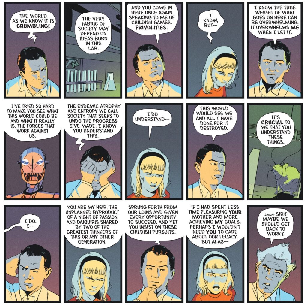 Although the result isn’t as looney-tunes-y as Elliott Kalan’s and Mindy Lee’s current run on Harley Quinn, it’s just as hilarious, nailing Haney’s voice, complete with an alliterative, hucksterish narrator, amusingly slangy dialogue, and conceptual games (like an issue packed with allusions to sixties’ spy fiction, albeit less caustic than We’re Taking Everyone Down With Us). Yet Lee Loughridge uses slick modern colors, making this a Tom Strong-like hybrid rather than a mere pastiche. It’s that balance and dissonance between the sensibilities of different eras that makes Metamorpho: The Element Man such an enjoyable read…