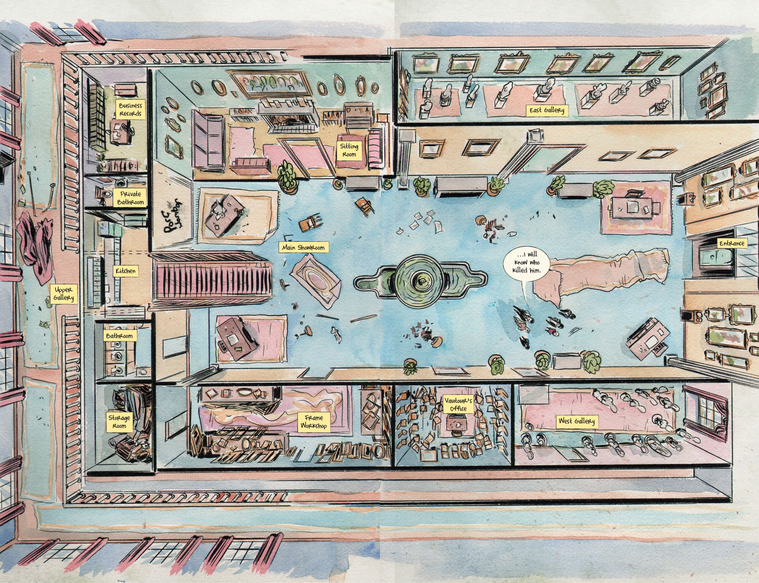 The same goes for Matt Kindt’s art, with letters by Sophia Hilmes. Besides the breezy tone of his typical watercolor-painted cartooning, Kindt keeps coming up with clever layouts (like the Cluedo-ish splash page above) that guide – and misdirect – you through this maze of a comic. Similarly, the back matter in the chapter breaks includes photographs, newspaper clippings, and other puzzle pieces for sporting readers to plough through and take a shot at sorting out the mystery before the final revelations.
