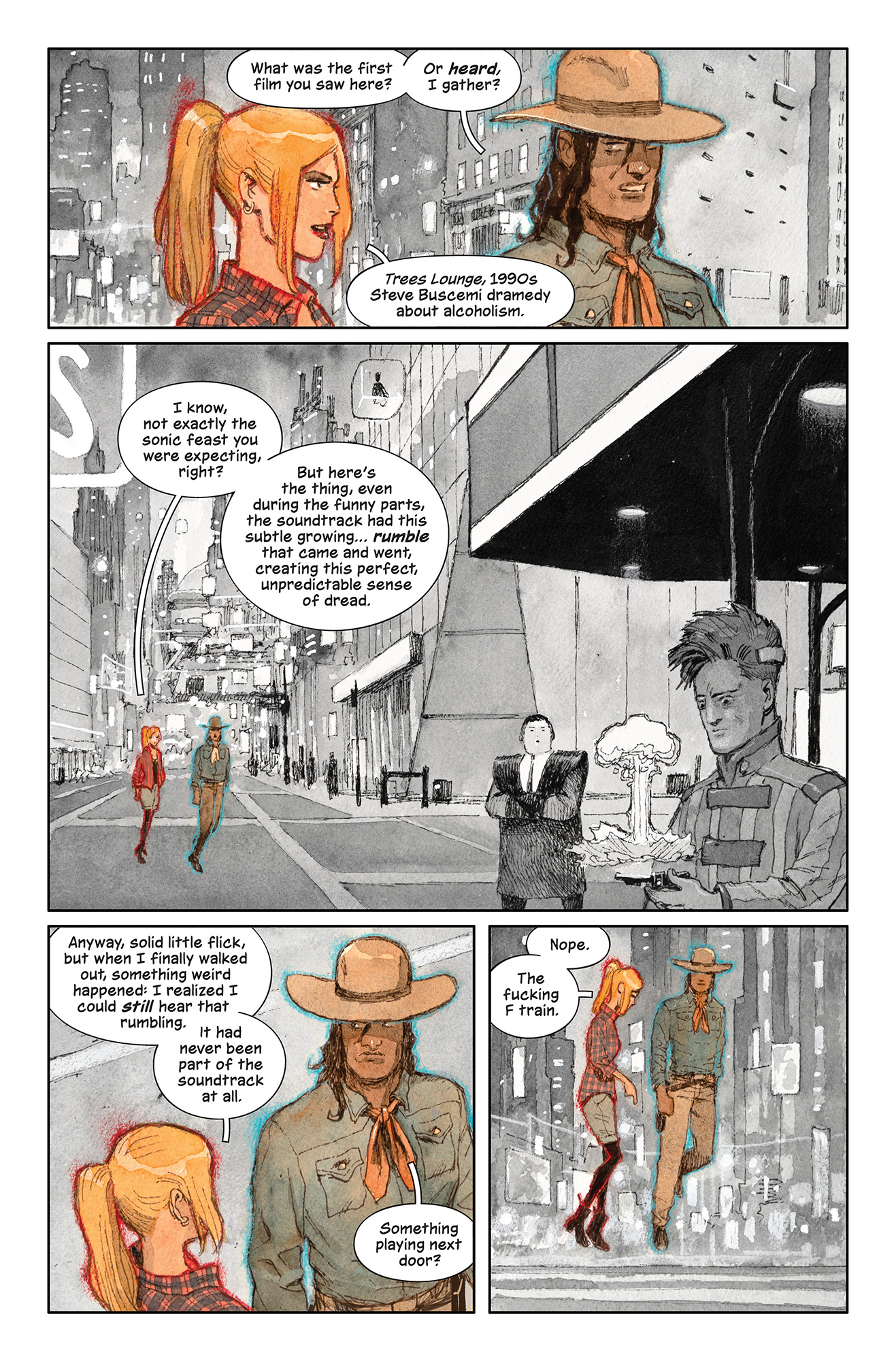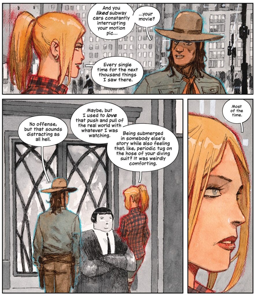 Although a fairly original and ambitious project for Brian K. Vaughan, Spectators is very recognizable in terms of the writer’s style (self-reflexive dialogue) and themes (pop culture, sexuality). Like Alan Moore, Vaughan has tackled sex in various ways throughout his career, with an overall view of eroticism that is neither naively celebratory nor conservatively repressive. Rather, their works generally acknowledge that sex can be complicated by power dynamics and contradictory feelings and impulses (as also explored in the TV show The Deuce or the film Diva Futura).