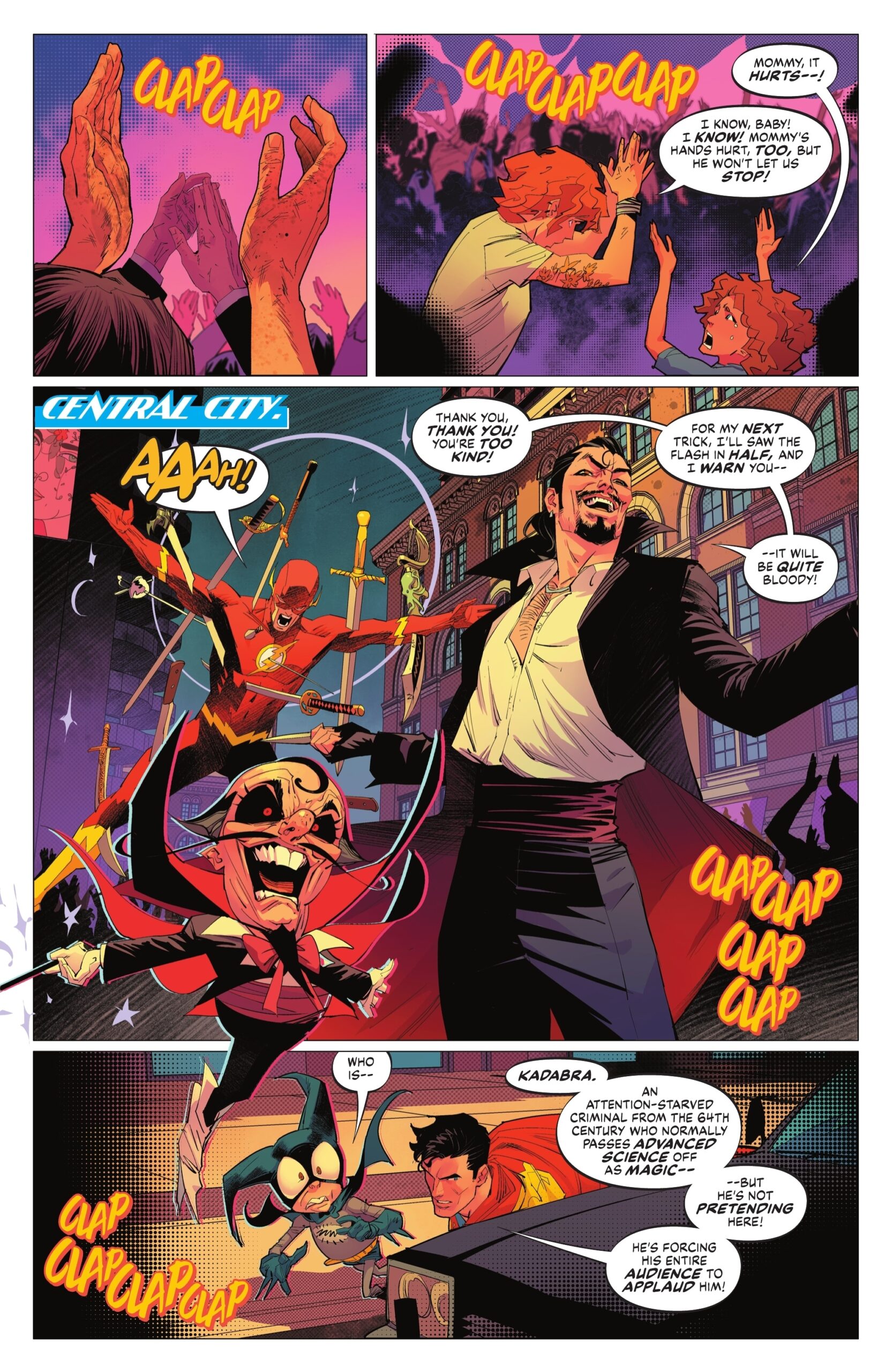 Regardless, Waid delivers enough fun moments and ideas to entertain even less knowledgeable readers. In fact, I would argue the book’s strongest point isn’t the way it plays with the DCU as much as the way it plays with the medium of comics. The abundant magic is vividly illustrated by Dan Mora and colored by Tamra Bonvillain, who come up with several inventive visual tricks without sacrificing clarity. Images collapse onto each other, heroes and villains pop into, out of, and through panel borders, exhibiting varying physical depth as they hop across dimensions.