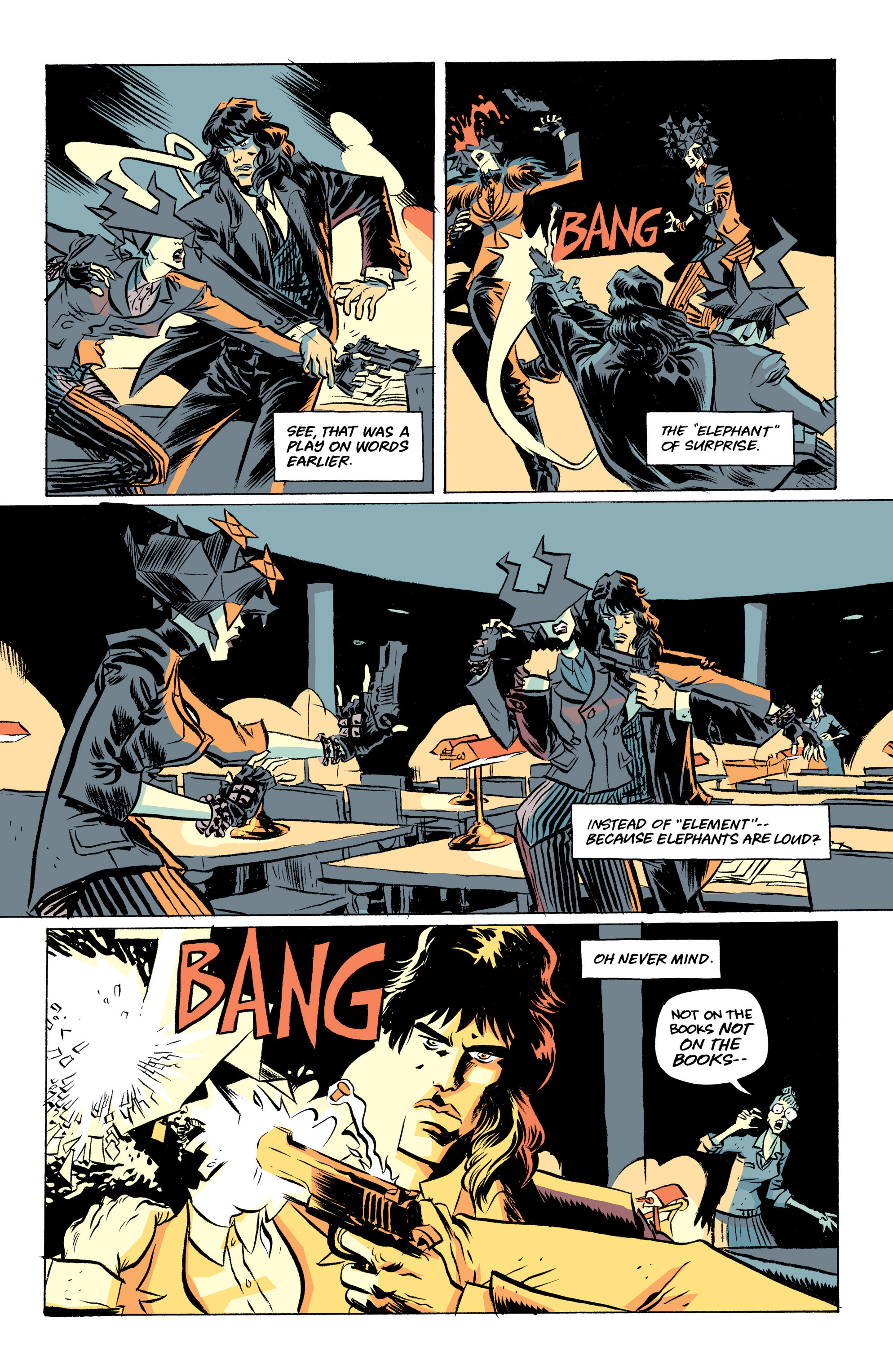 I’m sure it’s not easy for artists to keep up with such a barrage of moods and ideas, but Rachel Stott – inked by Felipe Sobreiro and occasionally backed up by Stephen Byrne and Pete Woods – pulls it off. On the surface, the whole thing may seem like your average action fest, especially if compared with the more aesthetically daring The Infinite Vacation, but some of the designs are quite original (starting with the plus-size Tabitha), the ‘acting’ is expressive enough to sell the drama, and the visuals ingeniously display this world’s madcap technology at work, as shown in the scan above (where you can also see letterer Simon Bowland joining the fun).