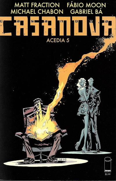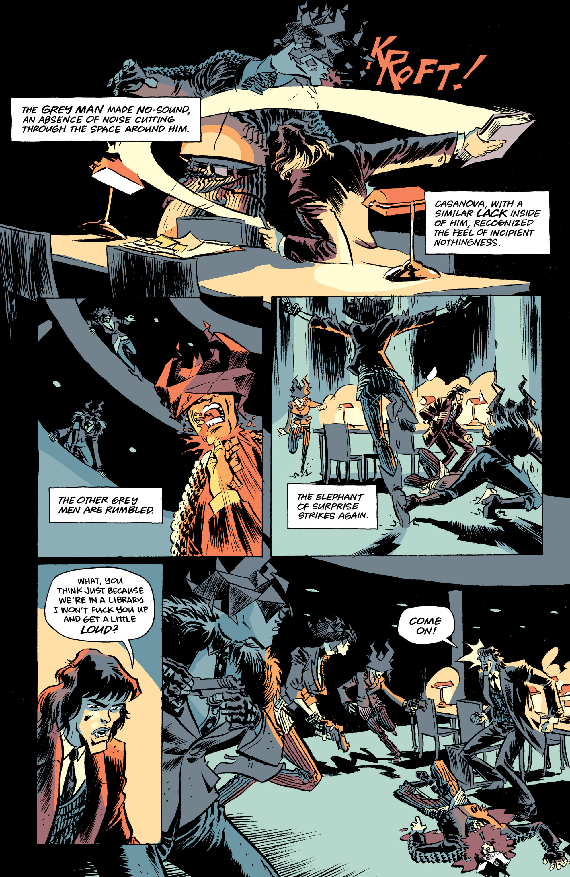 You can tell this is a labor of love for everyone involved, from Matt Fraction’s surreal creations and puzzle box-like plotting (which rewards multiple rereads) all the way to Dustin Harvin’s hand-lettered captions, not to mention the alternating artwork by the wonder twins Gabriel Bá and Fábio Moon (whose styles are as extravagantly sexy and cheerful as Fraction’s scripts). The original comics had a minimalistic palette (first black & white & green, followed by black & white & blue), but Cris Peter recolored the later editions and has since then become a regular member of the team – and while I still prefer the monotone versions, I admit her unnaturalistic choices are a perfect fit, powerfully bringing out Casanova’s dreamlike mood. Again, as you can see in the excerpt above, it all comes together beautifully.