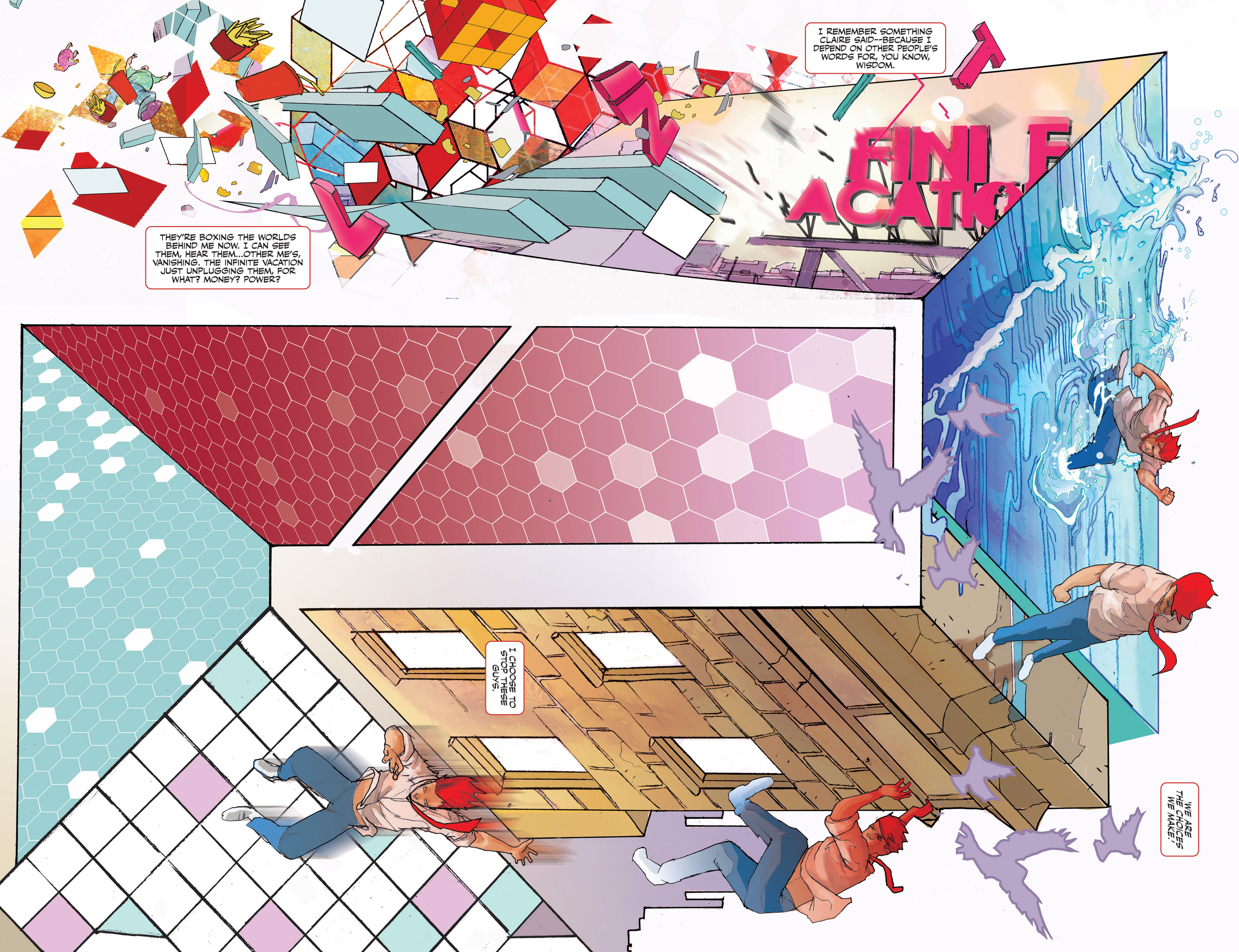 In 2011’s The Infinite Vacation, travel between alternate realities has become a massive commercial enterprise (a market dominated by the titular company), with 97% of people in the western world regularly displacing themselves into parallel universes where their life turned out differently. In this mind-bending scenario, we follow the vacation-obsessed Mark as he tries to figure out why all the other Marks suddenly seem to be dying… while also trying to romance Claire, a girl who rejects the escapism provided by The Infinite Vacation. The comic thus explores the paradox at the heart of the concept of a multiverse made up of the infinite ramifications of every decision and contingency in your life, demonstrating how this notion can be both liberating (tapping into endless possibilities) and limiting (obsessing about alternative paths rather than dealing with the consequences of your own reality).