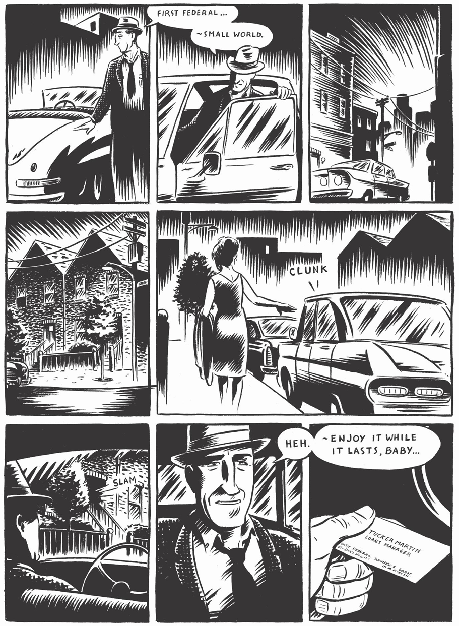Just like The Man Who Wasn’t There, Graham Chaffee’s To Have & to Hold is a brilliant recreation of classic film noir that rises above mere pastiche, capturing the genre’s aesthetics and period feel while cleverly filtering them with a modern perspective. Set in 1962, its largely nocturnal story also revolves around a great cast of flawed, frustrated people dreaming of more satisfying lives, including a cuckolded husband whose best laid plans combine crime and revenge… and who finds himself at the mercy of human whims and ironic coincidences. The expressionist brushstrokes, with a striking style reminiscent of Johnny Craig or David Lapham at their best, are not only highly atmospheric, but they also flow with incredible confidence, communicating much of the (internal and external) action visually. My favorite drawings are of brief moments and revealing poises of characters wrapped in deep thought, usually with a cigarette in their hands and a gaze pointed towards the distance, looking, if not profound, at least intensely concentrated on figuring out a path away from their present condition.