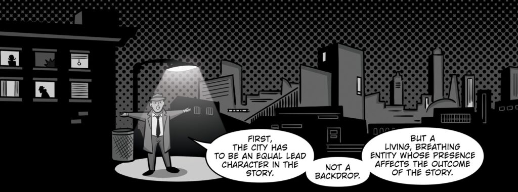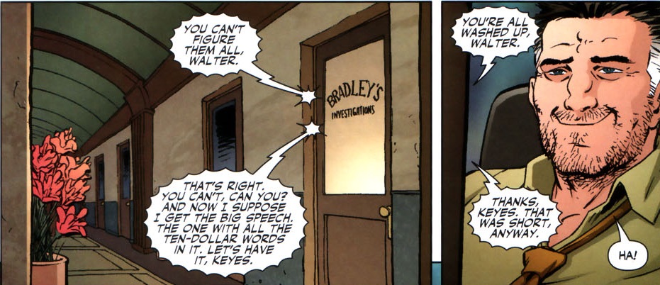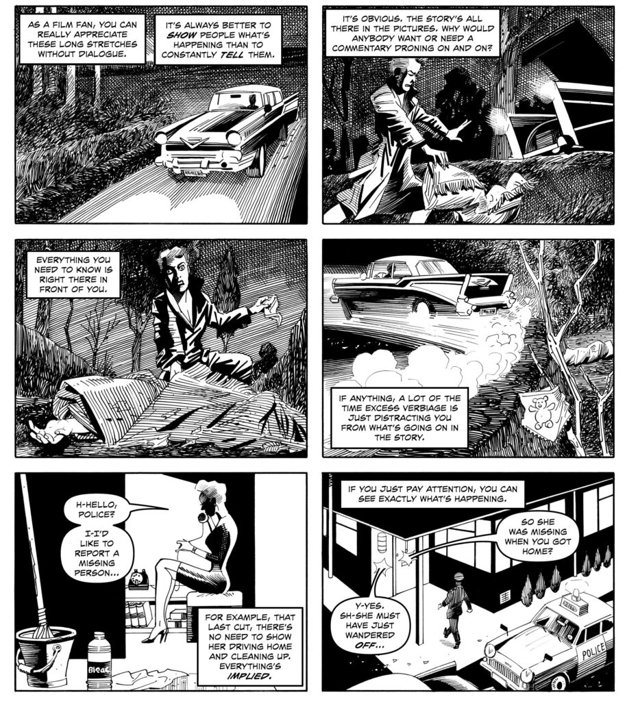 Aesthetically and ideologically, those stark, moody postwar thrillers about chain-smoking anti-heroes, doomed lovers, dirty cops, femmes fatales, and tangled crime plots inspired many of the comic books discussed in Gotham Calling (not least those starring Batman). Hell, they had a major impact across the medium from the start – in superhero comics as well as in other genres – and you can still see many acclaimed creators going back to that source time and time again… Just last year, Peter Milligan had a blast dissecting the tropes of this sort of hardboiled novels and films in the metafictional murder mystery Profane.