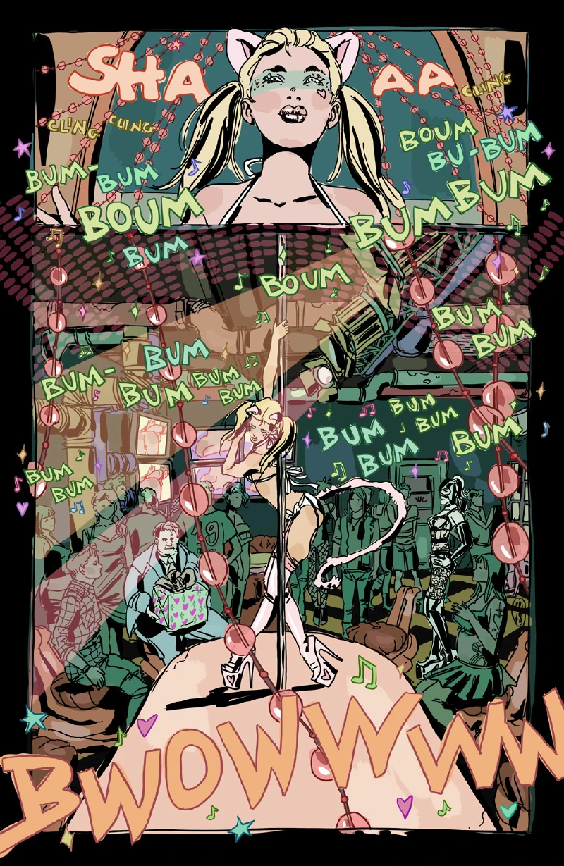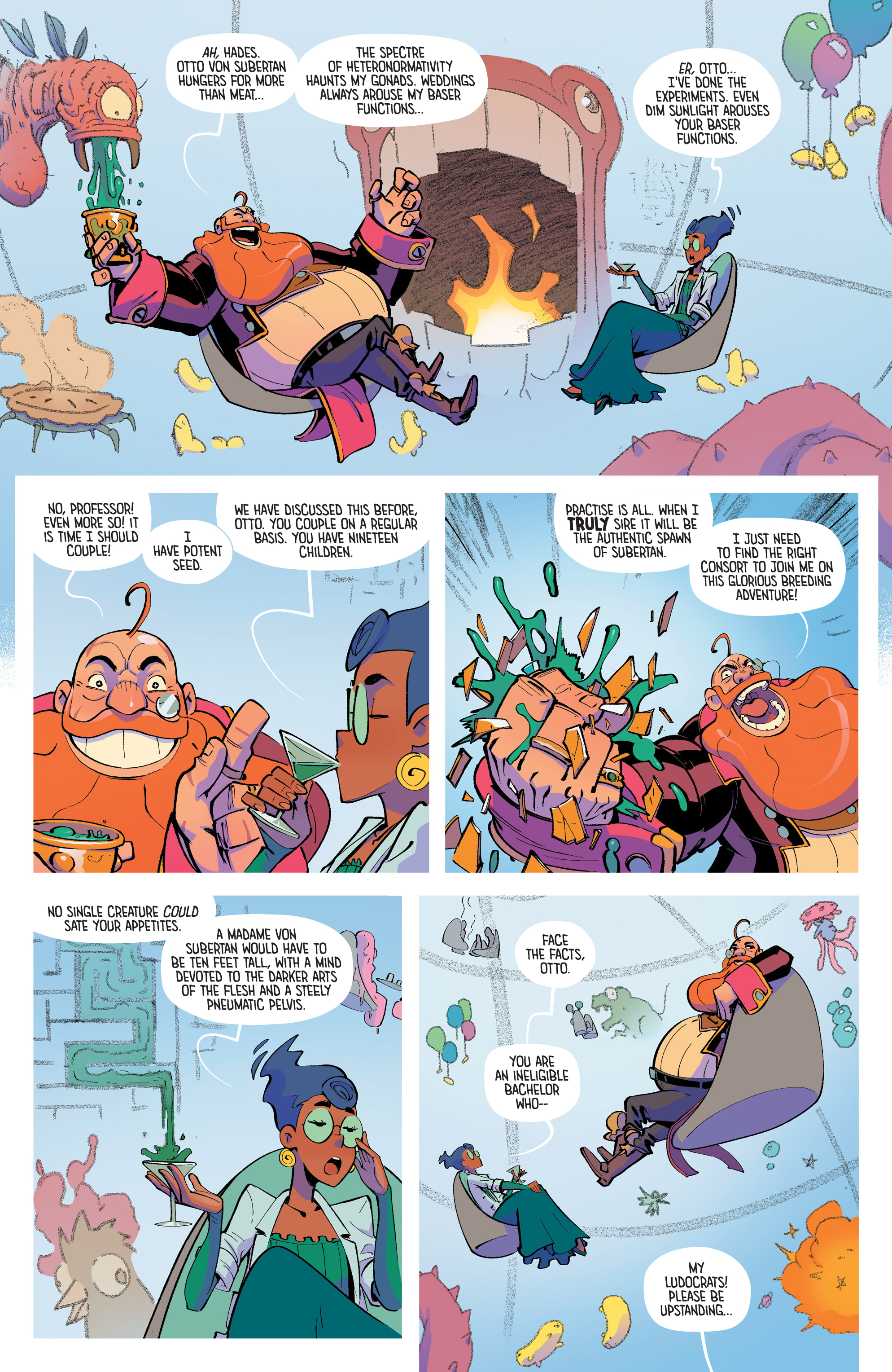 (It’s also a neatly designed splash page… I particularly enjoy the fish in the bottom right corner, who seems to be staring at the readers, mirroring their surprised look.)